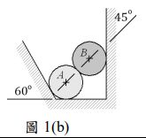 (二)滾輪 A、B 重量各為 200 N,其相對位置如圖 1(b)所示。假設滾輪 A、B 表面光滑,請畫滾輪 A 之自由體圖。