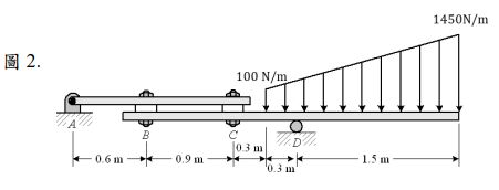 如圖 2 梁受一均勻負載,其負載密度如圖所示,試求系統 A、C 及 D 點之反作用力。