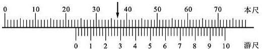 二、如圖所示為一游標卡尺量測物體尺寸之示意圖,該游標卡尺的精度為0.02 mm;若箭頭所指為主尺(或稱本尺)與副尺(或稱游尺)刻劃對齊之位置,則該物體之正確尺寸是多少mm?