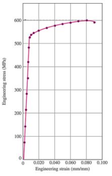 六、熔煉7075鋁合金,加工成標準拉伸樣品,經過T6熱處理之後,以室溫萬能試驗機測試,分析得到畫出下方數據結果,其為工程應力應變曲線(Engineering Stress and Strain Curve),依定義說並試算此合金樣品楊氏係數(Young’s modules), 降伏強度(Yield strength), and 抗拉強度(Ultimate tensile strength)?