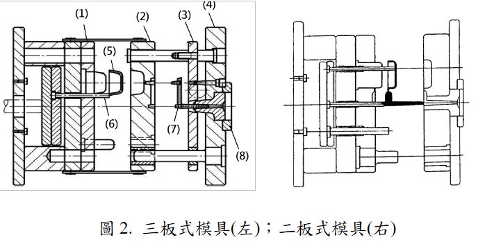 (A)模具構造簡單 (B)使用較低鎖模行程的射出機 (C)可以高速自動化生產 (D)成本較低。