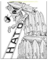 23.某國的宣傳刊物裡出現一則反映國際政治的漫畫(見右圖),梯子上寫著「HATO」。 關於這幅漫畫,以下解釋何者正確? (A)應該出自美國的刊物,主題是宣揚美國的國際影響力 (B)應該出自俄羅斯的刊物,主題是批評西方的反恐行動 (C)應該出自中國的刊物,主題是抨擊美國圍堵共產國家 (D)應該出自蘇聯的刊物,主題是嘲諷美國為盟國擔負責任