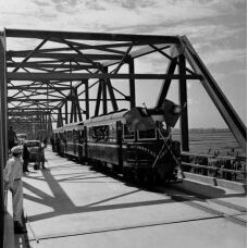 25.請閱讀以下資料: 右圖是西螺大橋通車當日的實景。早期旅客如需從彰化渡溪造訪雲 林,或改搭火車,或乘筏擺渡,極為不便。總督府有意興建橋梁以便人車通行,遂於 1930 年代末期動工,卻受制於特殊因素只完成橋墩部分。 隨著戰事結束,政府重啟橋梁興建,1953 年風光通車。竣工之初,橋體漆上近似溪水的鐵灰色,與現今的艷紅色大不相同,仔細搜尋還可以看到匹茲堡鋼鐵廠的出廠刻印! 有關西螺大橋發展史的敘述,請根據你的歷史知識判斷下列何者正確? (A) 1930 年代末中斷建橋工事與「工業日本、農業臺灣」有關 (B)西螺大橋竣工之後漆上鐵灰色,應該與二次大戰有直接關係 (C)題目的照片中有火車行駛與戰後新興的糖業運輸需求有關係 (D)橋體上面的刻印說明西螺大橋之復建與獲得美國援助有關係