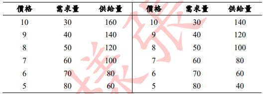30. 下表為小華對於某市場外部效果分析的作業,其中左半部的供給、需求價量關係未考慮外部效果,右半部的供給、需求價量關係考慮外部效果。根據下表資料判斷,有關此市場的外部效果,以下敘述最為正確?(A)存在此外部性時,市場均衡產量過低 (B)存在此外部性時,市場均衡價格過高 (C)在 該市場中生產者成本高於社會成本 (D)政府可透過課稅將市場的外部性消除。