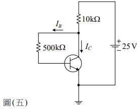 18. 如圖(五)所示電路,若電晶體的 β=60,=0.7V,則其電流值約為何? (A) 21.9μA (B) 2.19μA (C) 13.1mA (D) 1.31mA