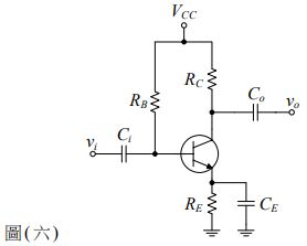 19. 如圖(六)所示電晶體共射極放大電路,旁路電容主要功能為何?(A) 增加電壓增益 (B) 增加輸入阻抗 (C) 降低輸出阻抗 (D) 使輸出信號與輸入信號同相位
