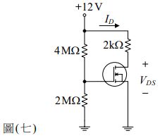 28. 如圖(七)所示電路,若此MOSFET臨界電壓=2V,導電參數K=0.5mA/V2,則電流為何?(A) 50mA (B) 20mA (C) 5mA (D) 2mA