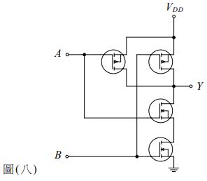 29. 如圖(八)所示MOSFET邏輯電路,其輸出Y為何? (A) Y =(B) Y =(C) Y= AB (D) Y = A+B