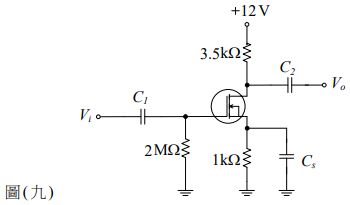30. 如圖(九)所示共源極放大電路,若此MOSFET的=2mS,則電壓增益為何?(A) – 2.5 (B) – 3.5 (C) – 5 (D) – 7
