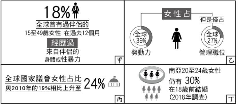 25.以上是根據聯合國《2019 年永續發展目標報告》製作的圖表。下列關於圖表內容的推論,何者最不恰當? (A)甲:82%的全球女性未曾遭受來自伴侶的身體或性暴力 (B)乙:全球女性在職場上擔任管理職位的比例較男性少 (C)丙:全球女性的參政比例有所提升,但仍為少數 (D)丁:2018 年至少有 30%的 20 至 24 歲南亞女性結過婚