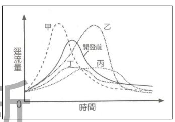 44. 水庫的興建不僅減少了下游發生洪患的機 會,也改變了河川的水文歷線,圖為河川水文歷線圖。其中開發前表示的是水庫興建前 的水文歷線,請問:水庫興建後,下游的水 文歷線將會變為以下哪一個情況? (A)甲 (B)乙 (C)丙 (D)丁