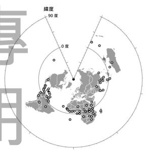 70. 下圖為繪有經緯線的世界地圖,請讀圖並選出臺灣六都都市之對蹠點(antipodes)所在的國家或區域? (A)巴拉圭 (B)阿根廷 (C)波多黎各 (D)巴西