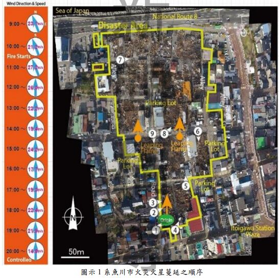 69. 一個麵店廚房的火星,造成小鎮火災,最終被認定為自然災害。位居日本本州北陸新潟縣面 向日本海的系魚川市於 2016 年 12 月 22 日上午火災,動員鄰近大都市的眾多救援人力與物力,將近 10 小時才控制火勢,共有 147 間建物全部或部分燒毀。請依據以下兩圖判斷,該 火災判定為自然災害最可能原因為何者? (A)聚落多為木造房舍 (B)乾燥的天氣與焚風 (C)聚落建物的密度高 (D)南側山脈為東西向