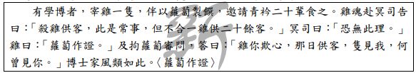 一天早上,得參買一擔生菜回來,想吃過早飯,就到鎮上去,這時候,他妻子才覺到缺少一桿「稱仔」。「怎麼好?」得參想,「要買一桿,可是官廳的專利品,不是便宜的東西,哪兒來的錢?」他妻子趕快到隔鄰去借一桿回來,幸鄰家 的好意,把一桿尚覺新新的借來。因為巡警們,專在搜索小民的細故,來做他們的成績,犯罪的事件,發見得多,他們的高昇就快。所以無中生有的事故,含冤莫訴的人們,向來是不勝枚舉。什麼通行取締、道路規則、飲食物規則、行旅法規、度量衡規紀,舉凡日常生活中的一舉一動,通在法的干涉、取締範圍中──。 他妻子為慮萬一,就把新的「稱仔」借來。