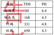 47. 放入紗布、石頭、木炭、沙子及纖維等材料進行自製濾水器淨化處理,倒進TDS 值為310、PH4.2的原液,再使用TDS(Total dissolved solids )水質檢測筆及酸鹼度檢測筆測量,下列哪一組的測量結果比較不可能達到? (A)貓頭鷹(B)啄木鳥(C)野鴿(D)杜鵑