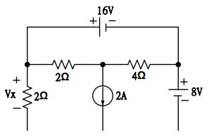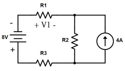 27.如下圖電路所示,若R1=2Ω,R2=6Ω,R3=2Ω,求出下列V1值為多少?(A)−3.6V(B)3.6V(C)6.4V(D)−6.4V
