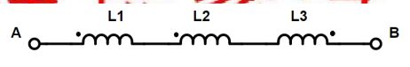29.下圖電路由L1、L2與L3三個電感串聯所組成,已知L1=5H,L2=6H,L3=9H,若L1與L2的互感=1H,L2與L3的互感=2H,L1與L3的互感=3H,各電感間的互助或互消關係如圖所示,求A、B兩端總電感值為多少?(A)20H(B)12H(C)9H(D)2H