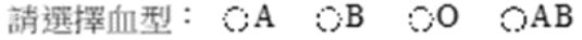 9. 若網頁輸出結果如下圖的血型選擇,則最適合使用下列何項 HTML 標籤? (A) input type = " button " (B) input type = " radio " (C) input type = " checkbox " (D) input type = " circle "
