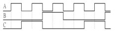 63. 如下圖所示,A 為輸入時脈(Clock),B 及 C 為輸出波形,則此電路為除幾之除頻器?(A)5(B)3(C)6(D)4