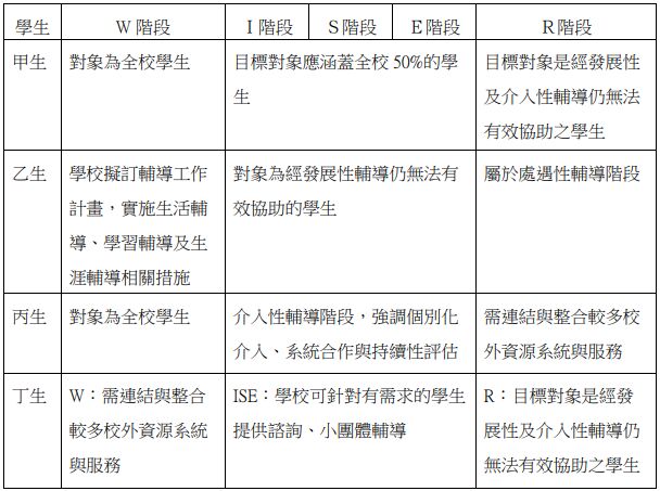 14. 下文為 4 位特教系學生針對 WISER 學校三級輔導運作模式所做的筆記,請問 4 名學生的描述何者正確? (A) 甲丁 (B) 甲乙 (C) 丙丁 (D) 乙丙