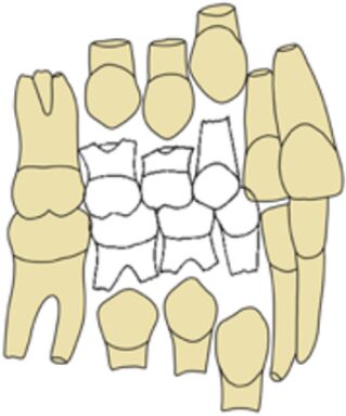 21.如圖所示,欲使用循序拔牙法時,應優先拔除何齒以解除上顎門牙區擁擠? (A)右上乳犬齒 (B)右下第一乳臼齒 (C)右上第一乳臼齒 (D)右上第一小臼齒