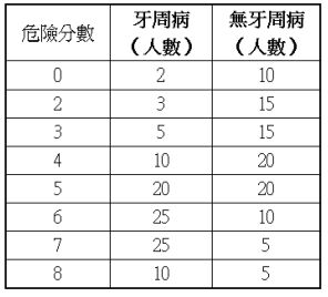 63.吾人對100名50歲患有牙周病的個案,與100名50歲無牙周病個案,試算其危險分數,並得到結果如下表: 若將大於等於5分(切點值)視為陽性,下列何者會造成敏感度增加?①調高切點值 ②調降切點值 ③於牙周病較盛行的族群中執行 (A)僅① (B)僅② (C)①③ (D)②③