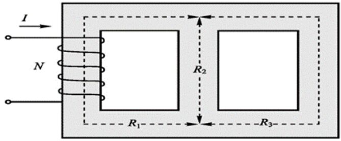 43. 如下圖所示,從線圈來看,其總磁阻為何?(A)R1+R2+R3 (B)R1 R2/(R1+R2)+R3 (C)R1+R2 R3/(R2+R3) (D)R1 R3/(R1+R3)+R2