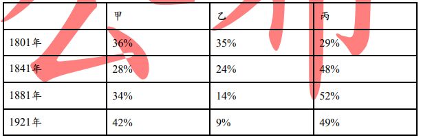 16. 經濟史家稱十九世紀英國是史上「第一個工業國家」。下表是1801到1921年,英國就業結構百分比的變化。根據十九世紀英國經濟發展趨勢判斷,甲、乙、丙分別是指: (A)甲、服務業;乙、農業;丙、工業 (B)甲、農業;乙、工業;丙、服務業 (C)甲、工業;乙、服務業;丙、農業 (D)甲、農業;乙、服務業;丙、工業。