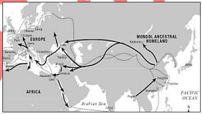 39. 下圖顯示十四世紀發生於歐亞大陸的重要現象,它最可能是: (A)絲綢西傳 (B)蒙古西征 (C)瓷器貿易 (D)鼠疫擴散