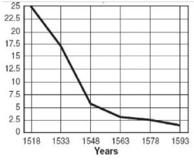 42. 下圖是墨西哥地區1518年至1593年的某項統計資料,此資料最可能是: (A)辣椒總生產量 (B)白銀出口數量 (C)人均耕地面積 (D)原住民人口數。