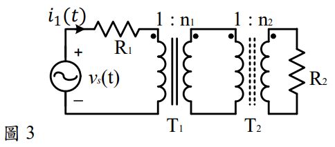 7.圖 3 電路中,T1與 T2為兩個理想變壓器,且其初、次級線圈的匝數比分 別為 1:n1 與 1:n2,則 i1(t)應為