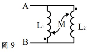14.圖 9 所示耦合電感中,若將其耦合係數 Km逐漸升高,則 A、B 兩端點間之電感量將
