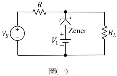 3. 如圖(一)所示之稽納(Zener)二極體電路,假設VZ = 4 V,膝點電流IZ= 0.1 mA,VS= 10 V,且V1 = 2 V。若R = 1 kΩ 且 RL = 8 kΩ,則在電阻?L上的消耗功率為何?