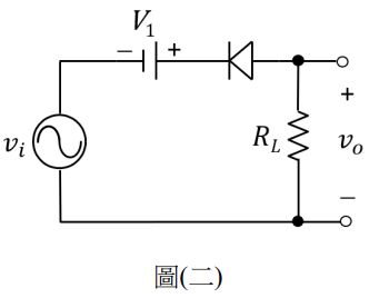 4. 如圖(二)所示之二極體電路,假設V1 = 2 V,二極體順向導通電壓為 0.7 V,RL = 1 kΩ 且vi = 10sinωt V,則流經電阻RL之最大電流的絕對值為何?