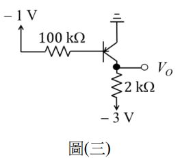 6. 如圖(三)所示之 PNP 雙極性電晶體(BJT)電路,假設β = 100,VEB = 0.7 V,則輸出電壓VO約為何?