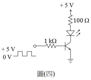 7. 如圖 ( 四 ) 所示之 NPN 雙極性電晶體閃爍電路, 假設其 β = 100 , VBE =0.7 V,飽和電壓VCE(sat) = 0.2 V,且發光二極體 LED 導通時兩端的壓降為1.5 V,則 流經 LED 之最大電流值為何?
