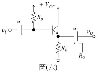9. 如圖(六)所示之電晶體放大器,假設RB = 200 kΩ,RE= 1 kΩ,β = 99,且小信號 電阻rπ = 1 kΩ,求此放大器之輸出阻抗RO為何?