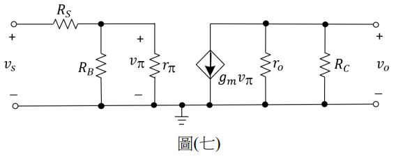 10. 如圖(七)所示之電晶體放大器交流等效電路,假設RS = 1 kΩ,RB = 10 kΩ,RC =2 kΩ,rπ = 2 kΩ,gm = 10 mA/V 且rO = 20 kΩ。求電壓增益vO/vS為何?