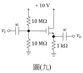 15. 如圖(九)所示之放大器電路,假設 N 通道增強型 MOSFET 之臨界電壓VGS(t) = 1 V, 參數k = 0.5 mA/V2,且厄力電壓(Early voltage)VA = ∞,則電壓增益Av約為何?