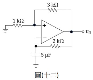 18. 如圖(十二)所示之理想運算放大器(OPA)電路,假設 OPA 之飽和輸出電壓為12 V, 則此電路之vO由正飽和輸出變成負飽和輸出之轉態電壓為何?