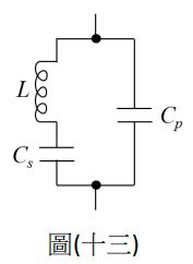 19. 如圖(十三)所示為一簡化的石英晶體電路模型,假設L = 16 × 10−6 H,CS = CP =2 × 10−12 F,則此石英晶體電抗值最大的頻率為何?