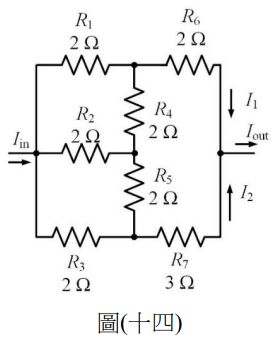 24. 如圖(十四)所示之電路,已知 Iin = 3A,求 I1 + I2 等於多少安培?