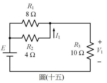 25. 如圖(十五)所示之電路具有一電源 E,已知其使 R3 產生 V1 = 30V,求 I1 為多少安培?