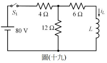 31. 如圖(十九)所示之電路,當開關 S1 閉合之後且達到穩態時,電流 iL 為多少安培( A )?