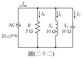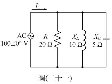 34. 如圖(二十一)電路所示,電源電壓 AC=100∠0°伏特,試求電流 I1 為多少安培( A )?