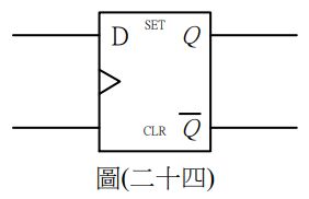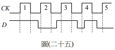 45. 考慮一正緣觸發 D 型正反器如圖(二十四),開始時 Q 之輸出為 0,隨後五個時間 區間之 D 訊號如圖(二十五),試分析在這五個時間區間內之輸出 Q 值依序為何?