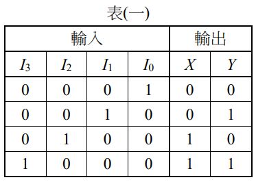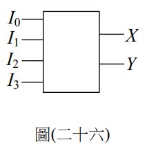 46. 考慮一 4 對 2 線編碼器如圖(二十六)所示,其真值表列於表(一)。當 I0 = 1 且其它 輸入皆為 0 時,輸出(X, Y)為(0, 0)。若欲進一步分析輸出 X 與 Y 的邏輯表示式,可 知其表示式不包含哪一條輸入線?