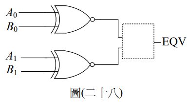 50. 利用兩個 XNOR 閘設計一 2 位元的 A、B 系統比較器如圖(二十八)所示,其中 A 系統之低、高位元分別為 A0 與 A1,B 系統之低、高位元分別為 B0 與 B1。若欲使 相對應的位元都是相等時輸出 EQV 為 1,否則為 0,則虛線部分應使用何種邏輯閘?