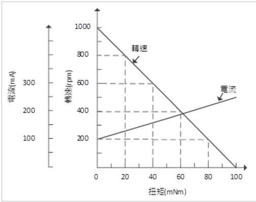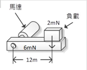 13. 如圖(a)所示為一個永磁(PM)馬達的扭矩轉速曲線,圖(b)所示,該馬達連接於一個長12m的機器手臂上,並且手臂末端有一個負載,其所形成的力為2mN,假設手臂為一個均勻分布的剛體,其重量集中於手臂的重心位置上,而手臂重量所形成的力是6mN,則該馬達轉速應為?
