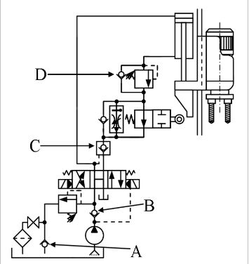 7. 如下圖為自動鑽床的油壓迴路圖,在迴路圖中共有 4 個止回閥(A、B、 C、D 四處),則 A、B、C、D 的順向開啟壓力(cracking pressure)分別約為3.5~5、8~10、0.3~0.5、0.3~0.5 kgf/cm2才能使迴路正常運作又可節省能源消耗。